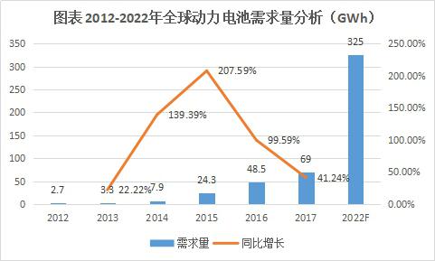2017年全球應(yīng)用于電動汽車動力電源規(guī)模為69.0GWh,是消費(fèi)電子、動力、儲能三大板塊中增量最大的板塊。GGII預(yù)計到2022年全球電動汽車鋰電池需求量將超過325GWh,相比2017年增長3.7倍。