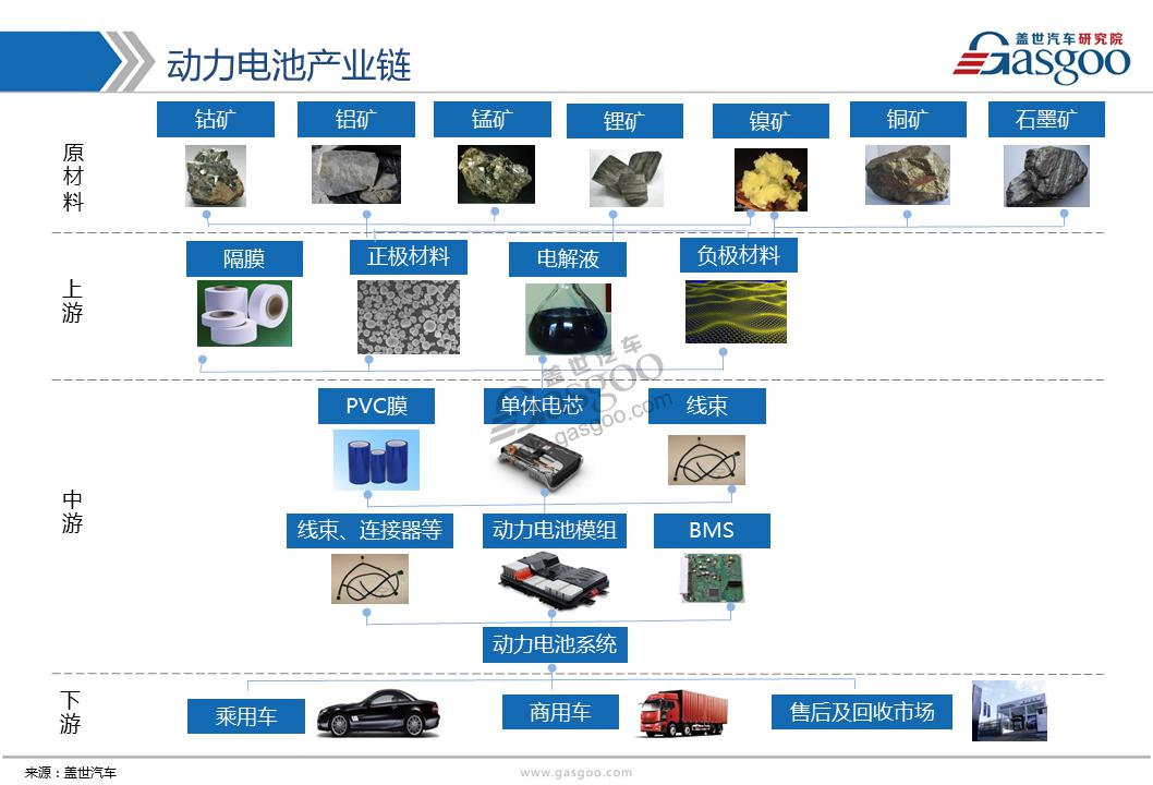 動力電池產(chǎn)業(yè)鏈分為上、中、下游,從下圖中可以看到,上游包括鈷、錳、鎳、鋰以及石墨礦產(chǎn),也是當(dāng)下主流動力電池原材料構(gòu)成。其中鋰礦應(yīng)用最為廣泛,而石墨一般只作為負(fù)極材料。中游產(chǎn)業(yè)鏈包括由正負(fù)極、電解液、隔膜、極耳加工形成電芯、PVC膜、線束。而下游產(chǎn)品則是電池模組、線束、連接器以及BMS管理系統(tǒng),整體形成動力電池零部件。