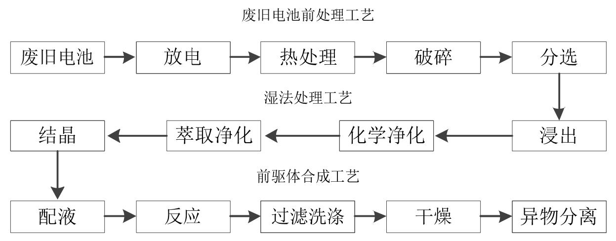 公司應(yīng)用電池回收技術(shù)生產(chǎn)鋰電池材料,主要產(chǎn)品是三元前驅(qū)體,其生產(chǎn)流程分為廢舊電池前處理工藝、濕法處理工藝以及前驅(qū)體合成工藝三階段,具體過程為: