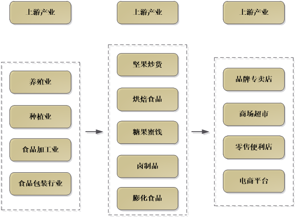 休閑食品行業(yè)的上游行業(yè)包括傳統(tǒng)農(nóng)業(yè)如種植業(yè)、養(yǎng)殖業(yè)、,食品添加劑、食品包裝行業(yè)。行業(yè)的下游主要是銷(xiāo)售環(huán)節(jié),通過(guò)多種渠道如大型商超、直營(yíng)店、經(jīng)銷(xiāo)商等進(jìn)行銷(xiāo)售,直面產(chǎn)品終端消費(fèi)者。