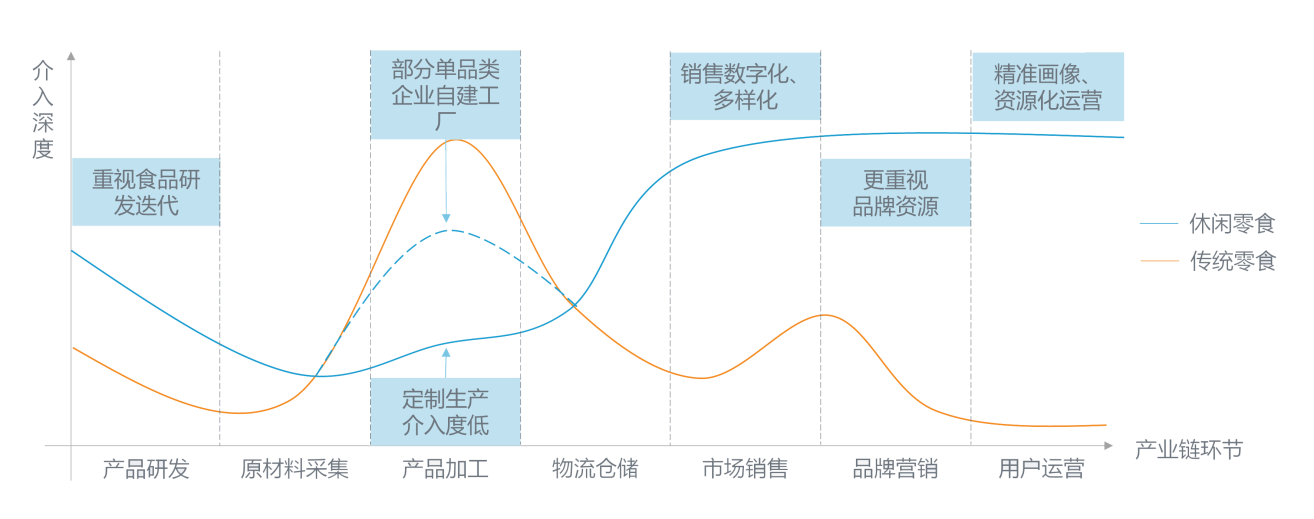 目前,市場(chǎng)上對(duì)休閑零食的劃分有五至十二個(gè)品類(lèi),每個(gè)品類(lèi)之中又包含若干子品類(lèi),導(dǎo)致休閑零食的市場(chǎng)碎片化嚴(yán)重;傳統(tǒng)食品企業(yè)跨品類(lèi)經(jīng)營(yíng)意味著重新購(gòu)置、配置一條生產(chǎn)線,成本巨大;同時(shí),部分休閑零食企業(yè)采用對(duì)外合作定制生產(chǎn)策略,僅發(fā)力于食品研發(fā)環(huán)節(jié),一定程度上改進(jìn)了以往重資產(chǎn)企業(yè)跨品類(lèi)難度大的問(wèn)題,孕生了平臺(tái)型、多品類(lèi)經(jīng)營(yíng)新業(yè)態(tài)。
