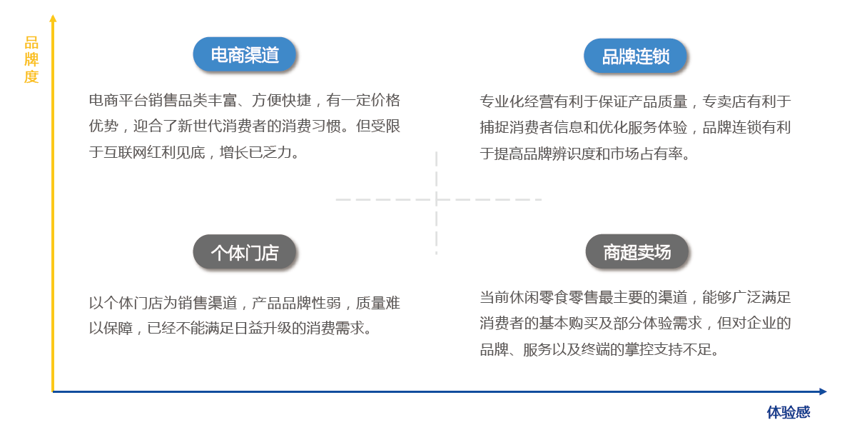 休閑零食的渠道陣營(yíng)主要有四大類(lèi):傳統(tǒng)的個(gè)體門(mén)店和商超賣(mài)場(chǎng),新興的品牌連鎖和電商渠道。在新零售浪潮的沖擊下,四大陣營(yíng)此消彼長(zhǎng),個(gè)體門(mén)店的市場(chǎng)份額不斷縮減,商超賣(mài)場(chǎng)的渠道影響力也將減弱,品牌連鎖和電商渠道將成為未來(lái)休閑零食新消費(fèi)的主流渠道。