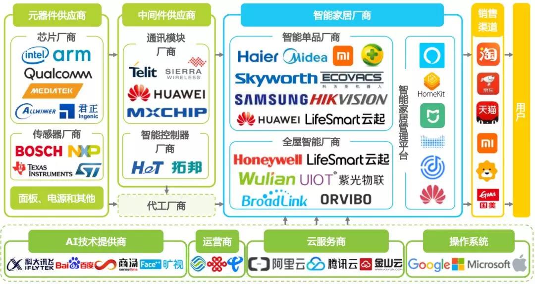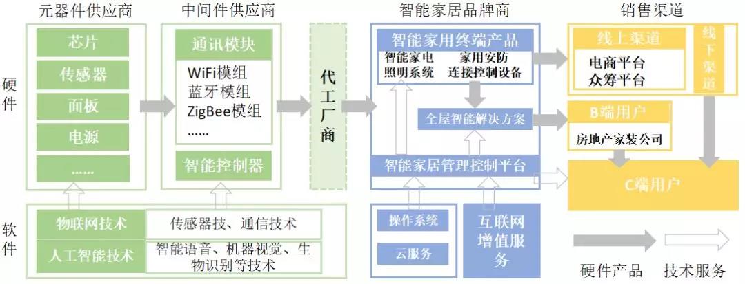 通常所指的智能家居企業(yè)為智能家居品牌商,涵蓋向最終用戶提供終端產(chǎn)品、解決方案和設(shè)備管理控制平臺(tái)的企業(yè),底層除物聯(lián)網(wǎng)操作系統(tǒng)、云服務(wù)作為管理控制平臺(tái)的支撐外,還包括內(nèi)容服務(wù)、生活服務(wù)等互聯(lián)網(wǎng)增值服務(wù)。智能家居產(chǎn)業(yè)鏈上游主要是芯片、傳感器等元器件供應(yīng),以及通訊模塊和智能控制器等中間件供應(yīng)商。品牌商可以通過(guò)線上、線下零售渠道直接向C端用戶銷售終端產(chǎn)品,也可以面向房地產(chǎn)、家裝公司等B端客戶提供整體解決方案。