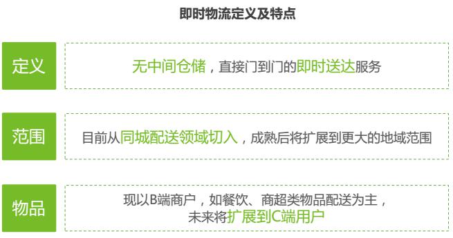 即時物流在餐飲外賣等行業(yè)有所涉及。2009年,“即時物流”概念由點我達創(chuàng)始人趙劍鋒提出。2016年8月,點我達接受阿里巴巴近10億元投資,“即時物流”概念廣泛傳播。2016年11月召開的互聯(lián)網(wǎng)大會上,美團點評和餓了么相繼強調(diào)“即時配送”業(yè)務(wù)。區(qū)別于傳統(tǒng)物流方式,即時物流的核心特點在于即時性,滿足用戶提出的極速、準時的配送要求。目前,即時物流以同城、小件領(lǐng)域切入,拓展到生鮮、商超配送領(lǐng)域,再逐步擴展到更為廣泛的快遞末端領(lǐng)域。