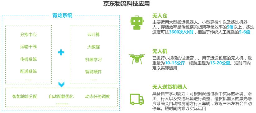 京東于2016年成立了X事業(yè)部,專注智慧物流相關(guān)技術(shù)的研發(fā)。2017年4月京東物流宣布獨立運營,成立物流子公司。截止2017年6月,京東在全國范圍內(nèi)擁有256個大型倉庫,6906個配送站和自提點,包括已經(jīng)運營了7個大型智能化物流中心“亞洲一號”。目前京東自營配送覆蓋了全國98%的人口,壓縮商品流通成本70%,提升物流運營效率2倍以上。京東物流科技的應(yīng)用主要包括兩個方面,一是基于大數(shù)據(jù)預(yù)測分析技術(shù)實現(xiàn)智能化的調(diào)度、決策;二是采用一些更自動化、智能化的設(shè)備提升物流效率,最終提升客戶的體驗。