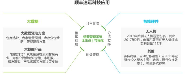 順豐速運成立于1993年,截止2016年12月,順豐控股業(yè)務(wù)覆蓋全國331個地級市、2620個縣區(qū)級城市,近13000個自營網(wǎng)點。順豐速運業(yè)務(wù)包括國際業(yè)務(wù)、同城配送、冷運、重貨(陸路&航運)等。順豐一貫重視在信息化領(lǐng)域的投入,負責(zé)集團信息系統(tǒng)研發(fā)與運維的科技人員超過2,000名,16年信息技術(shù)費投入2.6億、占營業(yè)成本0.57%,相較15年提升0.08個百分點。14-16年來,順豐控股申報和獲得的專利523項,軟件著作權(quán)200多項。未來,順豐還將繼續(xù)擴大在科技領(lǐng)域投入,不斷提高各方面的科技與智能化水平。
