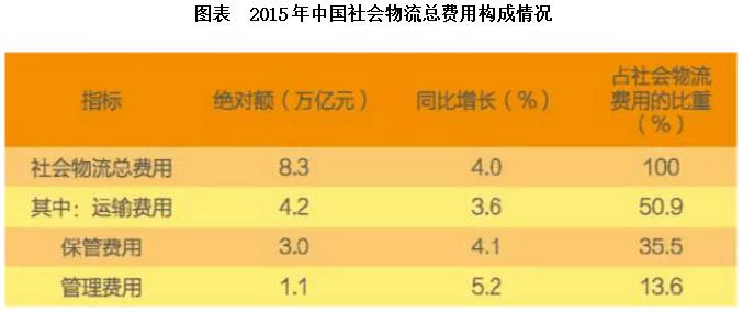 2015年1-10月,社會物流總費用規(guī)模為8.3萬億元,同比增長4.0%,增速比1-9月回落0.1個百分點。從結(jié)構(gòu)看,運輸費用4.2萬億,同比增長3.6%,占社會物流總費用的比重為50.9%;保管費用3.0萬億,同比增長4.1%,占社會物流總費用的比重為35.5%;管理費用1.1萬億,同比增長5.2%,占社會物流總費用的比重為13.6%。