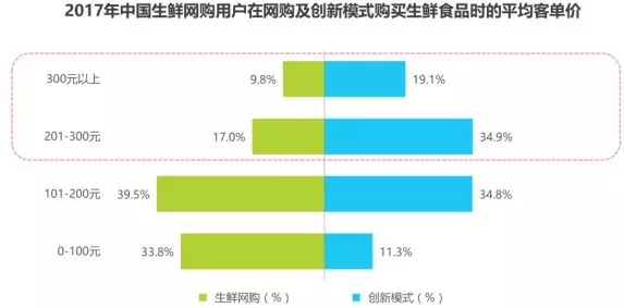 從消費金額來看,用戶在創(chuàng)新模式消費的單均價明顯高于生鮮網(wǎng)購整體,超過50%的用戶在創(chuàng)新模式消費的單均價超過200元。其中,19.1%的用戶在創(chuàng)新模式消費單均價超300元,而這一比例在整體生鮮網(wǎng)購平臺僅9.8%。34.9%的用戶在創(chuàng)新模式的客單價在201-300元之間,僅有17.0%的整體生鮮網(wǎng)購用戶客單價在這一區(qū)間。