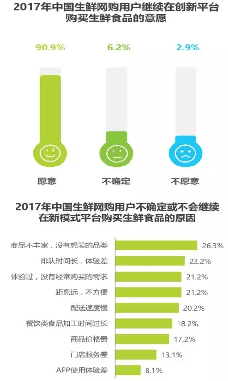 九成以上用戶愿意繼續(xù)網(wǎng)購生鮮食品,配送速度慢和品質(zhì)問題是用戶不確定或不會繼續(xù)購買的主因。