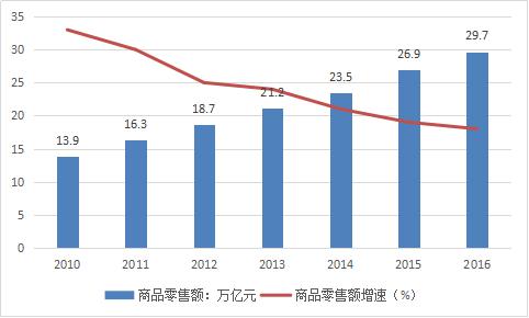 2016年我國商品零售額為296518億元,同比增長10.4%,增速比上年降低0.2個(gè)百分點(diǎn),降幅比上年收窄1.4個(gè)百分點(diǎn)。