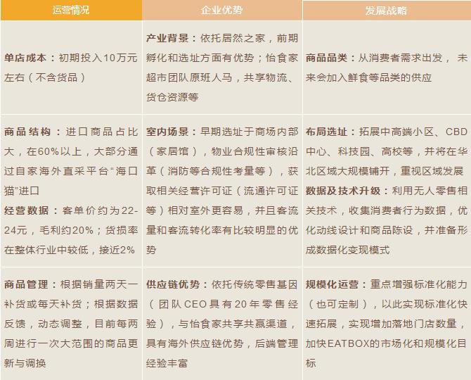 EATBOX由居然之家于2017年7月推出,定位于中高端小區(qū)、高校、CBD及科技園等。EATBOX 首店面積約30平米,設(shè)有9個(gè)貨架、2臺冰柜,主要銷售零食、飲料酒水、日化等商品,SKU約600~700個(gè),進(jìn)口商品SKU約400個(gè)。