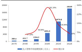 據(jù)艾媒咨詢預(yù)測,2017年我國無人零售商店交易額預(yù)計(jì)為389.4 億元,未來五年無人零售商店將會迎來發(fā)展紅利期,2020年的預(yù)計(jì)增長率可達(dá)281.3%,至2022年市場交易規(guī)模將超過1.8萬億元。同時(shí),艾媒咨詢預(yù)計(jì),2017年我國無人零售商店的用戶規(guī)模僅為600萬人,未來五年用戶規(guī)模將大幅增長,至2022年可達(dá)2.45億人。