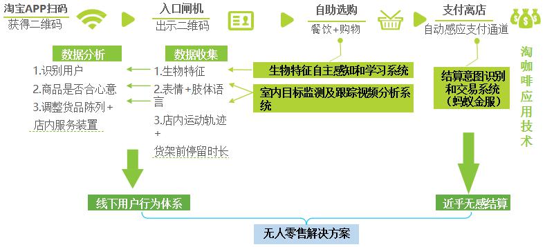 2017年7月阿里巴巴在淘寶造物節(jié)上推出無人便利店淘咖啡。淘咖啡經(jīng)營面積約200平米,分成超市區(qū)(無店員)和餐飲點(diǎn)單區(qū)(有少量店員),可一次性容納客流50人左右。消費(fèi)者通過手機(jī)淘寶 APP 掃碼進(jìn)店,選購?fù)瓿珊笮柰ㄟ^兩道結(jié)算門,當(dāng)?shù)谝坏篱T感應(yīng)到消費(fèi)者的離店需求時(shí)即會開啟,消費(fèi)者走出第一道門后,系統(tǒng)會自動對所購買商品進(jìn)行識別與結(jié)算,結(jié)算完成后第二道門自動打開,消費(fèi)者離店。