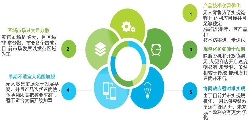 無人零售市場整體看好,但發(fā)展仍受到一定困阻典型優(yōu)質(zhì)企業(yè)能夠起到很好的示范作用,整體無人零售市場有發(fā)展前景。但目前來看,不容忽視的是市場剛剛經(jīng)歷一年左右的發(fā)展,還處于前期探索階段,因此還存在一些比較共性的發(fā)展困阻,主要集中在產(chǎn)品技術(shù)優(yōu)化、區(qū)域市場拓展、企業(yè)規(guī)?;l(fā)展、企業(yè)開放加盟和供應(yīng)鏈的協(xié)同效應(yīng)。