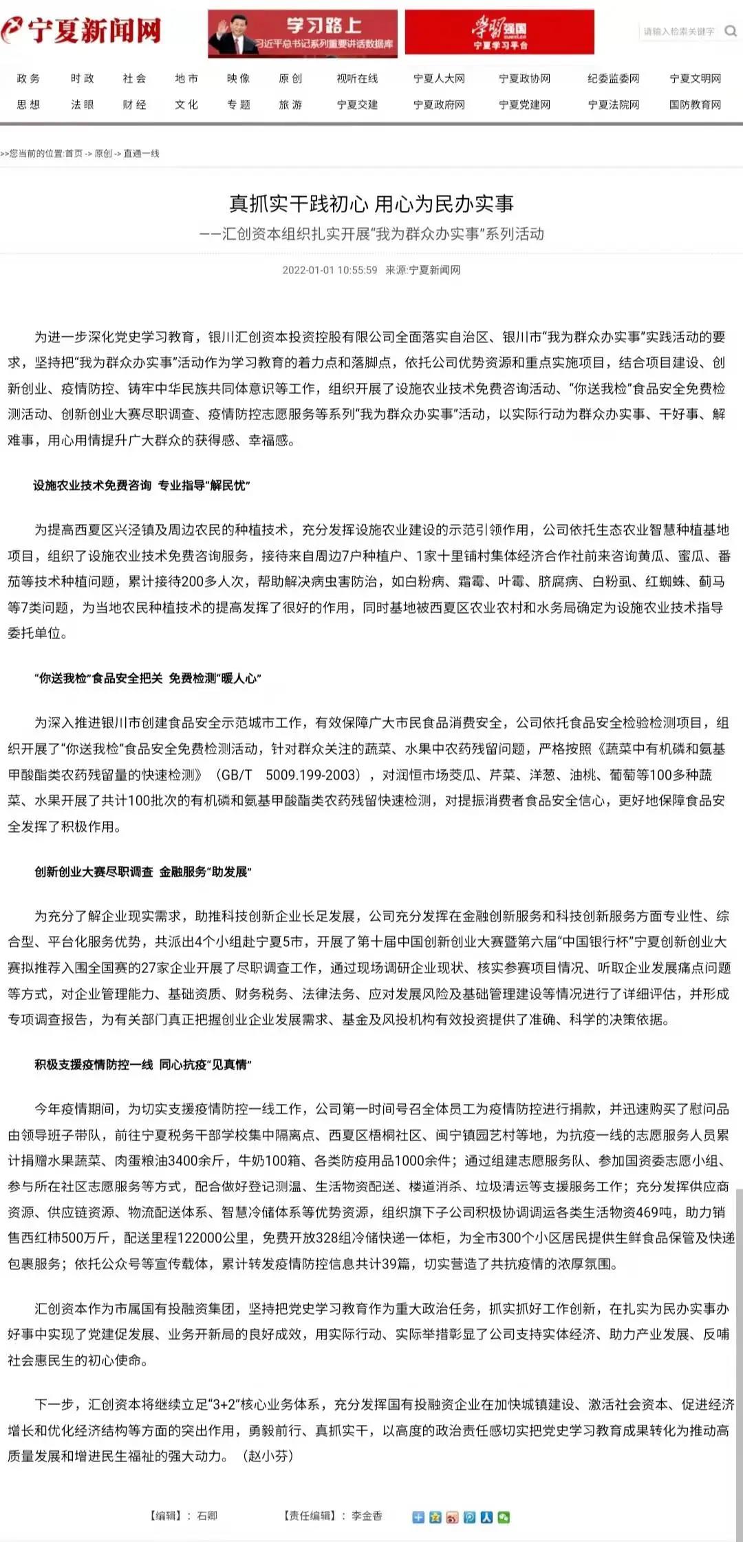 為進(jìn)一步深化黨史學(xué)習(xí)教育,匯創(chuàng)資本全面落實(shí)自治區(qū)、銀川市“我為群眾辦實(shí)事”實(shí)踐活動的要求,堅(jiān)持把“我為群眾辦實(shí)事”活動作為學(xué)習(xí)教育的著力點(diǎn)和落腳點(diǎn),依托公司優(yōu)勢資源和重點(diǎn)實(shí)施項(xiàng)目,結(jié)合項(xiàng)目建設(shè)、創(chuàng)新創(chuàng)業(yè)、疫情防控、鑄牢中華民族共同體意識等工作,組織開展了設(shè)施農(nóng)業(yè)技術(shù)免費(fèi)咨詢活動、“你送我檢”食品安全免費(fèi)檢測活動、創(chuàng)新創(chuàng)業(yè)大賽盡職調(diào)查、疫情防控志愿服務(wù)等系列“我為群眾辦實(shí)事”活動,以實(shí)際行動為群眾辦實(shí)事、干好事、解難事,用心用情提升廣大群眾的獲得感、幸福感,獲得了寧夏新聞網(wǎng)宣傳報(bào)道。