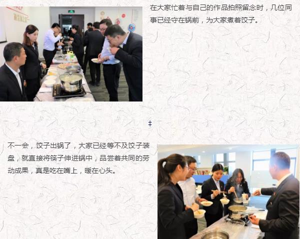 大家分成“愛吃餃子”“會做餃子”“多彩生活”和“幸?;▋骸彼膫€組合,展開了包餃子比賽。只見他們熟練的搟面皮、放餡料、捏餃子,十指翻飛之間,剁餡聲、歡笑聲、音樂聲,交織在一起,每個人臉上都洋溢著燦爛的笑容,公司里充滿了歡聲笑語,匯聚成了一片歡樂的海洋。